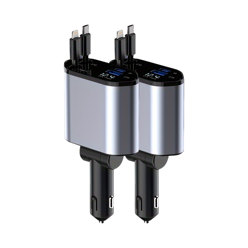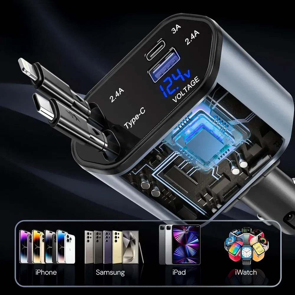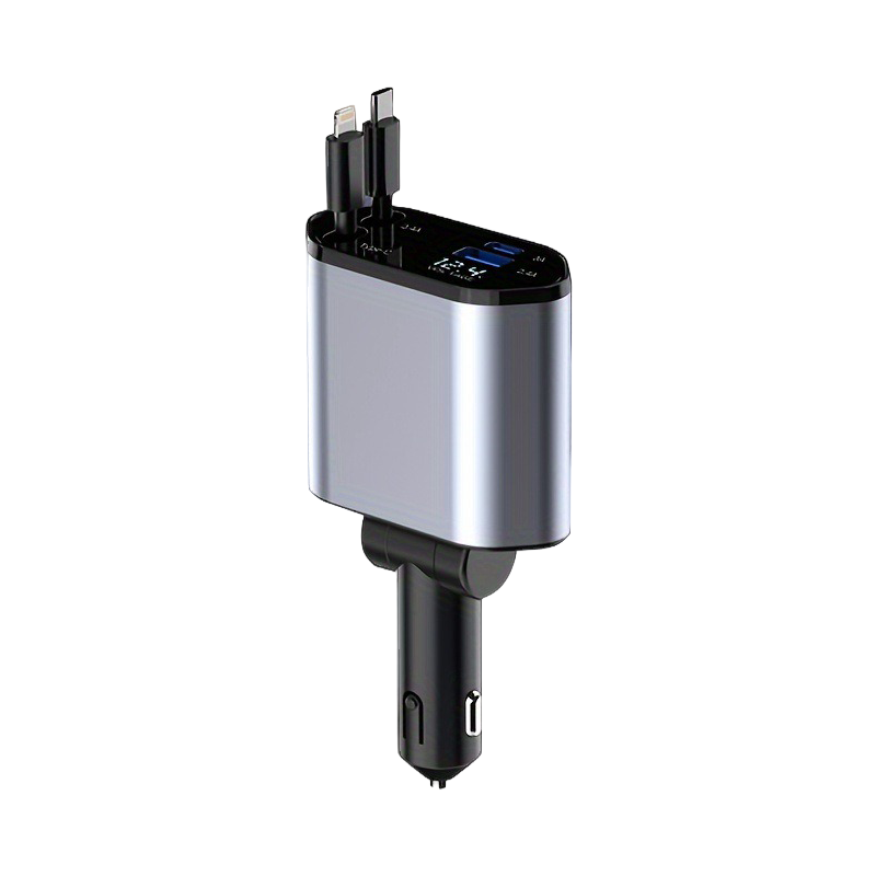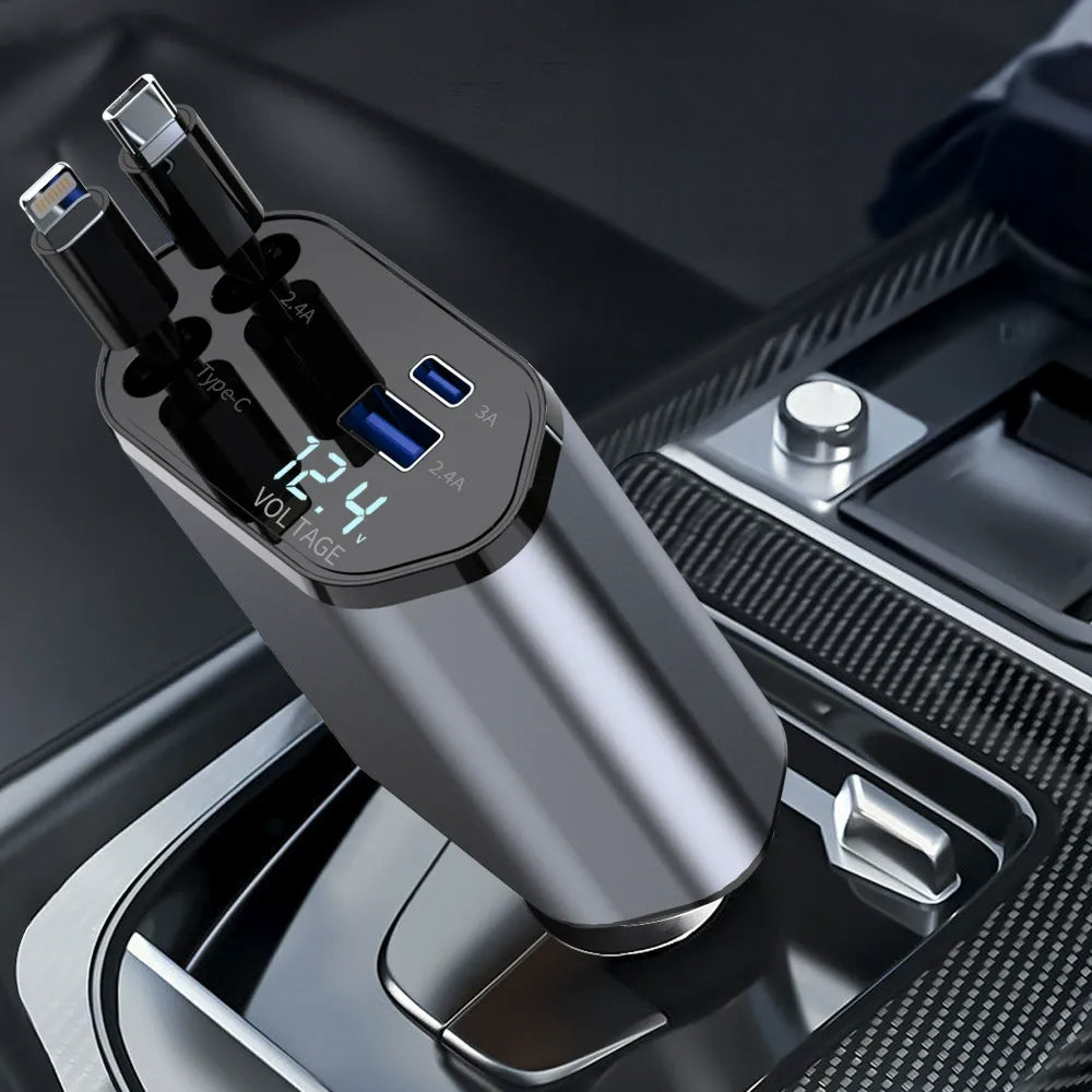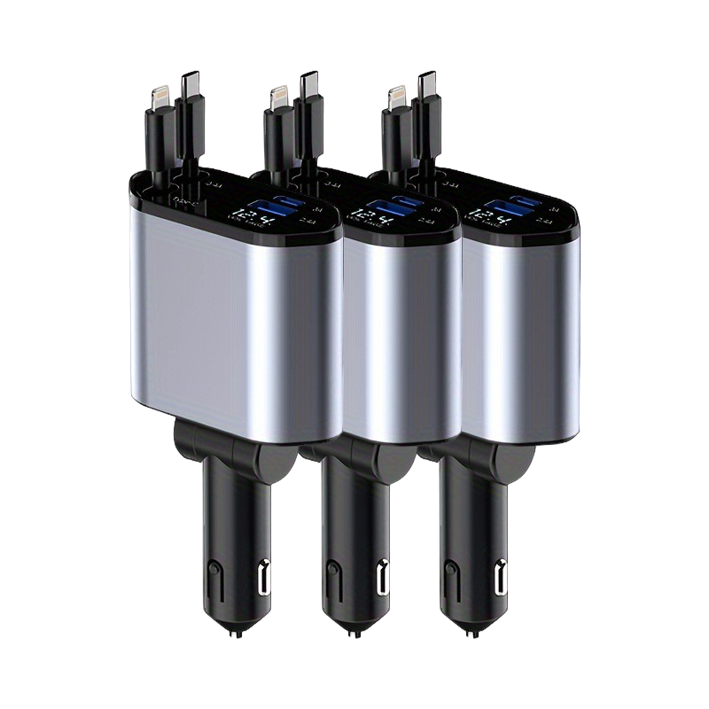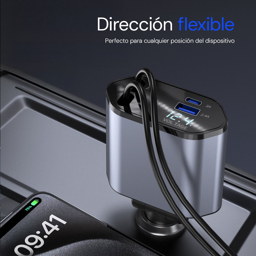 Un cargador retráctil 4 en 1 de 120W listo para usar. No necesitas accesorios adicionales ni instalación complicada.