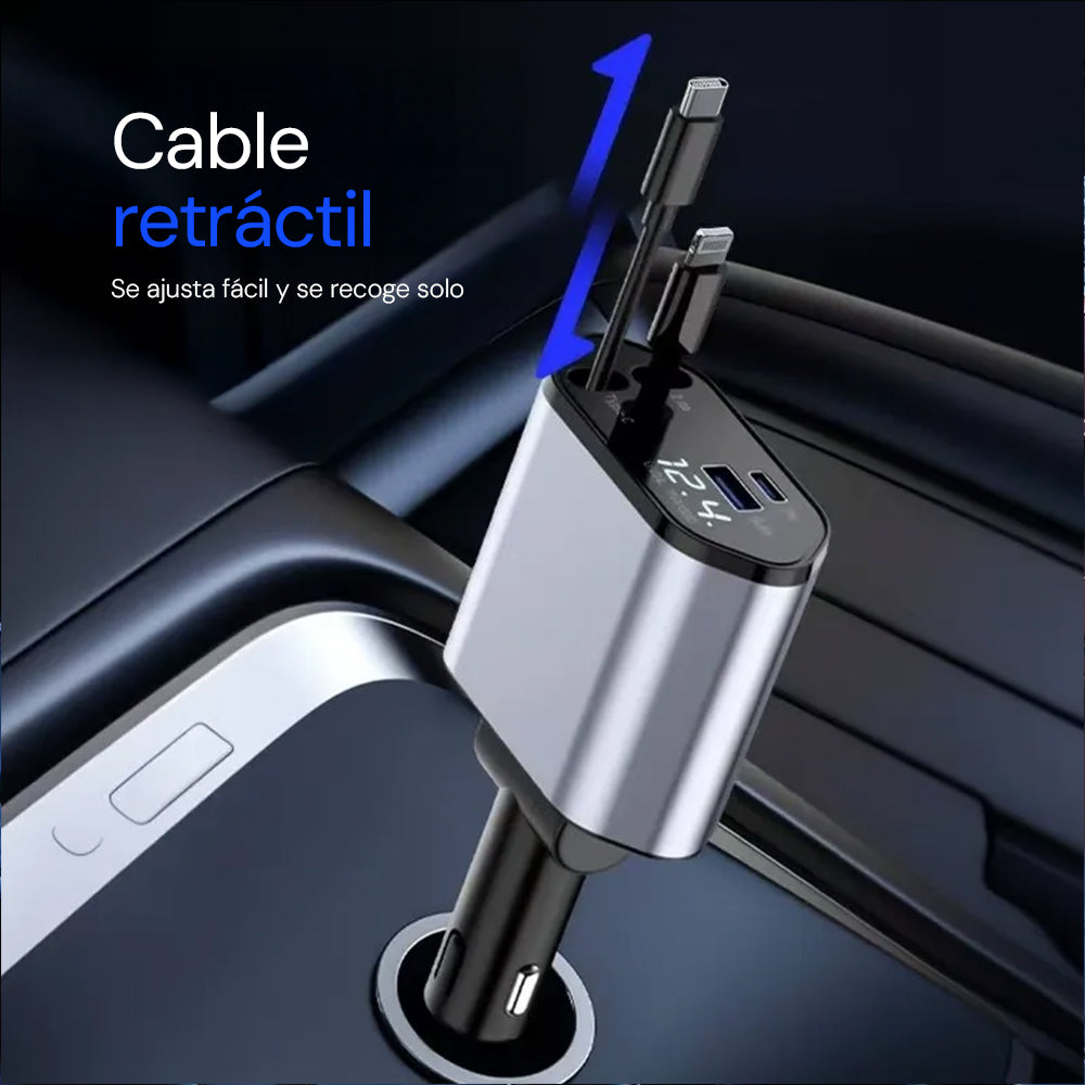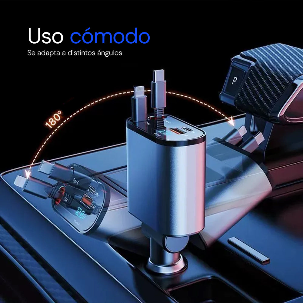 Carga rápida, orden y compatibilidad total en tu auto. Con este cargador retráctil de 120W tendrás energía en segundos para todos tus dispositivos, desde iPhone, Samsung, Huawei y Xiaomi hasta tablets, portátiles y Nintendo Switch.