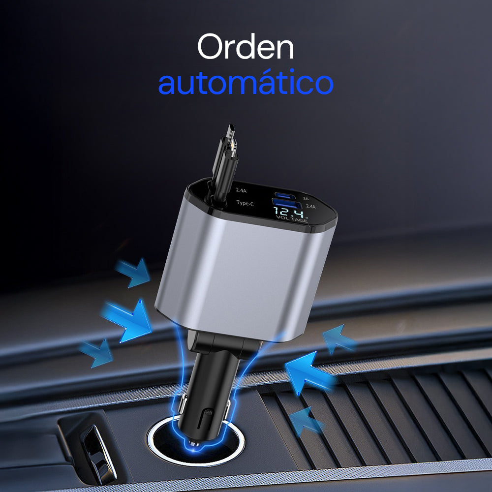 Es un cargador de auto retráctil 4 en 1 de alta potencia (120W) que te permite cargar varios dispositivos al mismo tiempo sin cables enredados. Integra cables retráctiles, puertos USB y USB-C, y una pantalla que muestra el voltaje de tu auto para mayor seguridad.